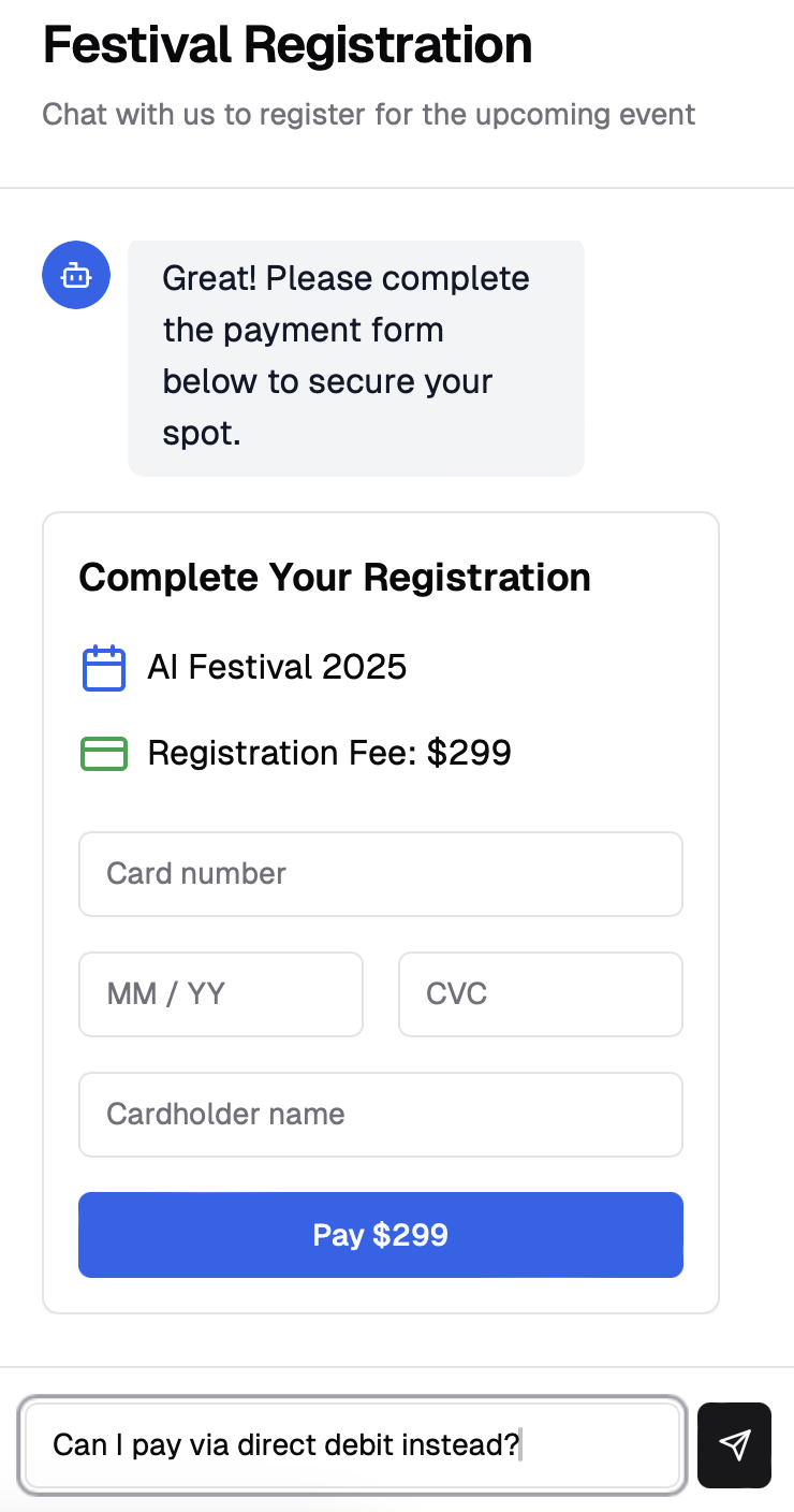 event registrationsddContact Formsinto conversations. Let your users respond in any language, ask clarification and follow up questions, and get validated responses every time.
